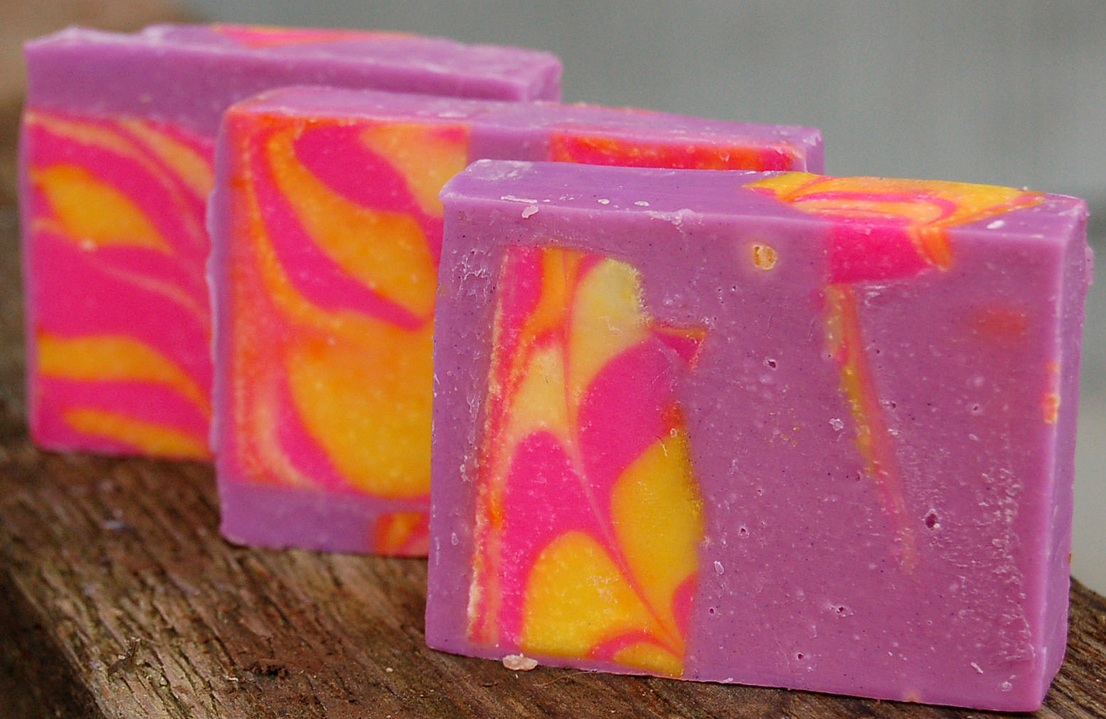 Lavender Orange Experiment With more lavender than orange, this soap smells stronger when wet than dry. In fact, I was going to originally write that this soap has very little scent that was until I washed my hands with and the smelled the fragrance come alive. This is another one of my experiments in color. Hard bars with silky creamy lather. Note: Each bar is slightly different in look as some have more yellow/pink imbeds than others.